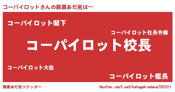 | 意味不明あだ名 | 『永久保存コーパイロット』 |