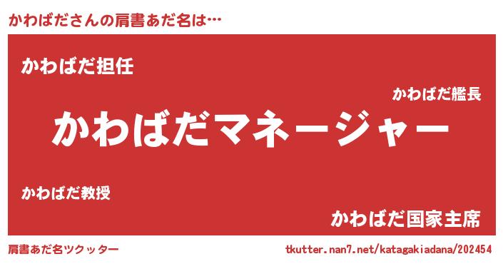 | 男性向けラノベタイトル風あだ名 | 『はたらくかわばださま!』 |
