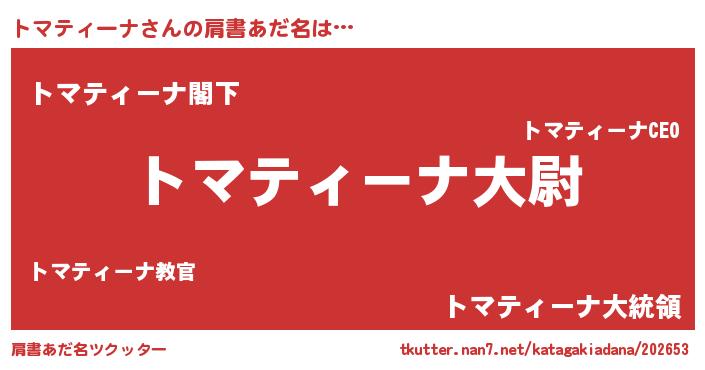 | 女子向けラノベタイトル風あだ名 | 『トマティーナの玉の輿計画!』 |