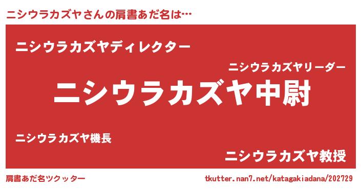 | 男性向けラノベタイトル風あだ名 | 『ニシウラカズヤ~年齢イコール彼女いない歴の魔法使い~』 |