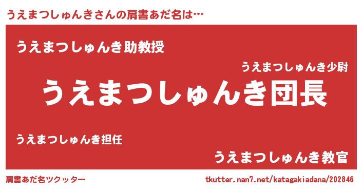 | 男性向けラノベタイトル風あだ名 | 『うえまつしゅんきの嫁は女の子じゃないと思った?』 |
