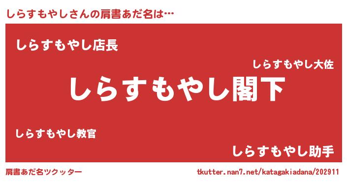 | 男性向けラノベタイトル風あだ名 | 『Re:しらすもやしから始める異世界生活』 |