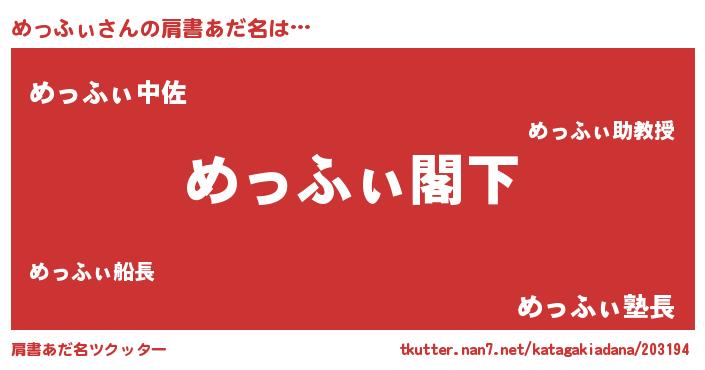 | 男性向けラノベタイトル風あだ名 | 『魔法科高校のめっふぃ』 |