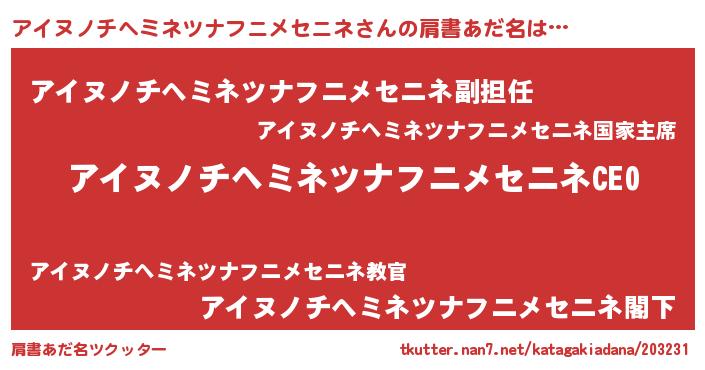 | 欧米人風あだ名 | 『マイケルアイヌノチヘミネツナフニメセニネ』 |