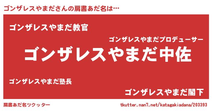 | 男性向けラノベタイトル風あだ名 | 『ゴンザレスやまだ~年齢イコール彼女いない歴の魔法使い~』 |