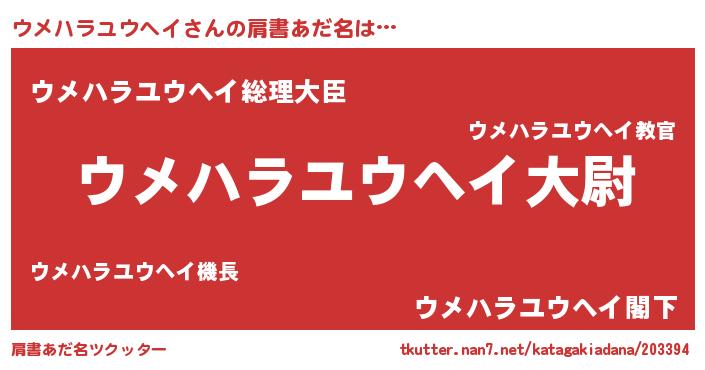 | 男性向けラノベタイトル風あだ名 | 『ウメハラユウヘイスレイヤー』 |