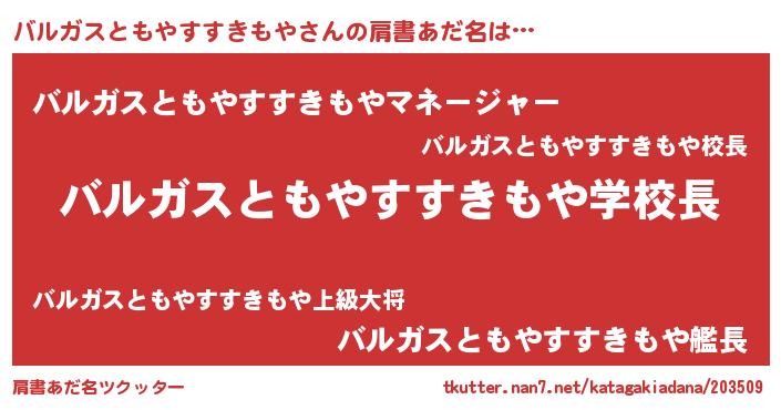 | 女子向けラノベタイトル風あだ名 | 『バルガスともやすすきもや恋絵巻』 |