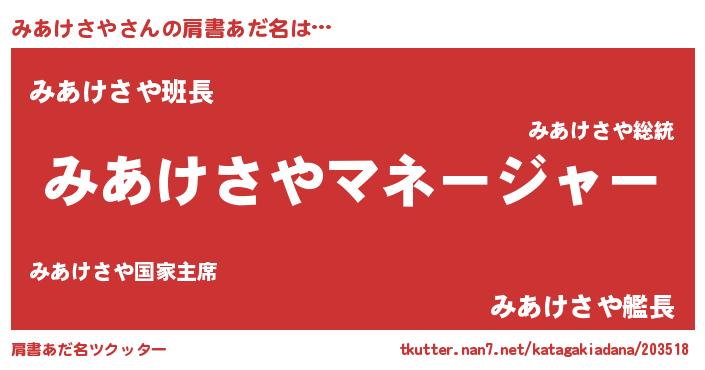 | 男性向けラノベタイトル風あだ名 | 『みあけさやに滅ぼされるだけの簡単なお仕事です』 |