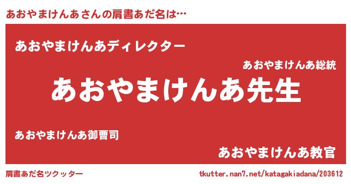 | 男性向けラノベタイトル風あだ名 | 『あおやまけんあという概念が存在しない退屈な世界 』 |