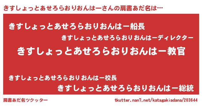 | 男性向けラノベタイトル風あだ名 | 『この素晴らしい世界にきすしょっとあせろらおりおんはーを!』 |