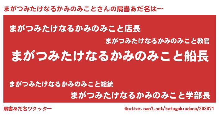 | ヒーロー風カッコイイあだ名 | 『スーパーマガツミタケナルカミノミコト』 |