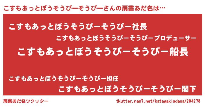 | 男性向けラノベタイトル風あだ名 | 『冴えないこすもあっとぼうそうぴーそうぴーの育てかた』 |
