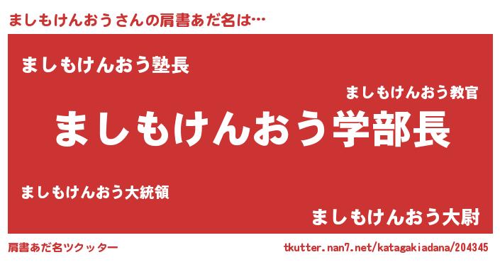 | 男性向けラノベタイトル風あだ名 | 『おまえをオタクにしてやるから、俺をましもけんおうにしてくれ! 』 |