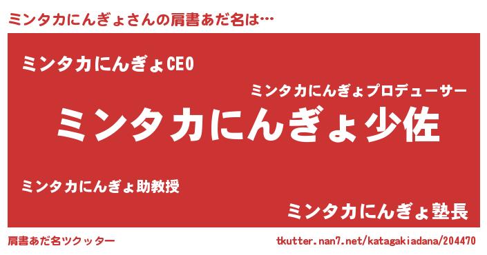 | 男性向けラノベタイトル風あだ名 | 『ミンタカにんぎょ~年齢イコール彼女いない歴の魔法使い~』 |