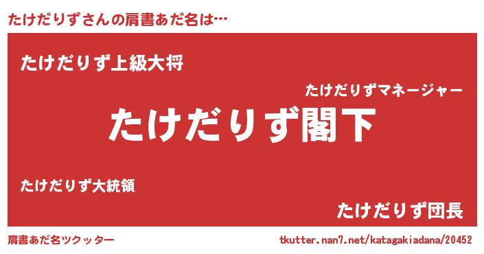 | 女子向けラノベタイトル風あだ名 | 『たけだりずなんてお断りですっ。』 |