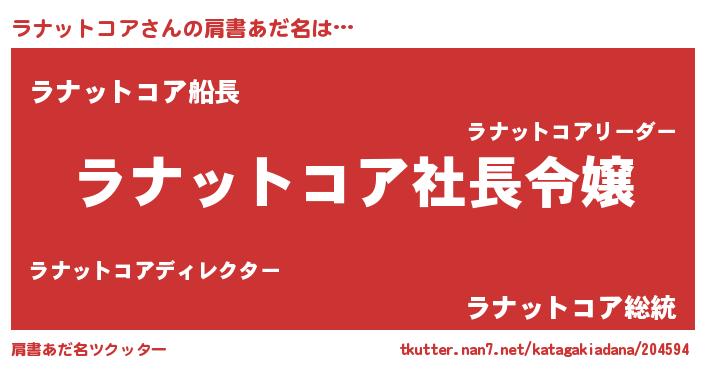 | 女子向けラノベタイトル風あだ名 | 『(仮)ラナットコアのやんごとなき事情』 |