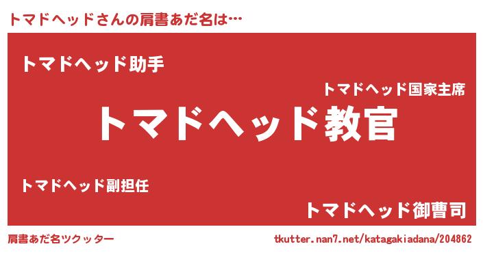 | 男性向けラノベタイトル風あだ名 | 『魔弾の王とトマドヘッド』 |
