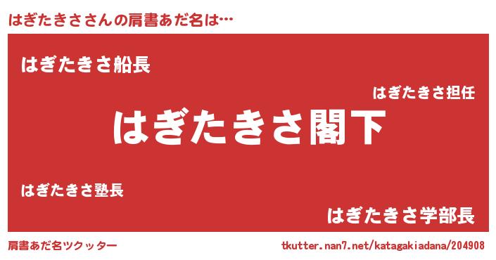 | 男性向けラノベタイトル風あだ名 | 『Re:はぎたきさから始める異世界生活』 |