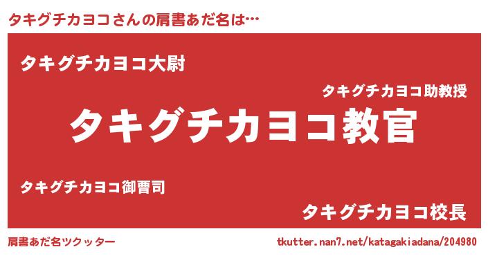 | 男性向けラノベタイトル風あだ名 | 『この素晴らしい世界にタキグチカヨコを!』 |
