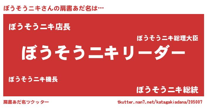 | 女子向けラノベタイトル風あだ名 | 『ぼうそうニキは平凡を望む』 |
