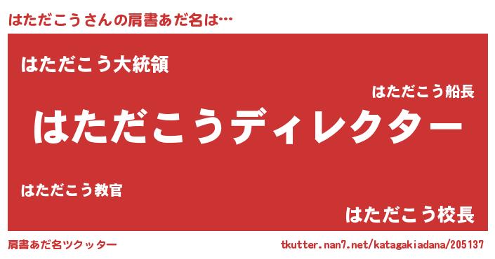 | 男性向けラノベタイトル風あだ名 | 『はただこうに滅ぼされるだけの簡単なお仕事です』 |