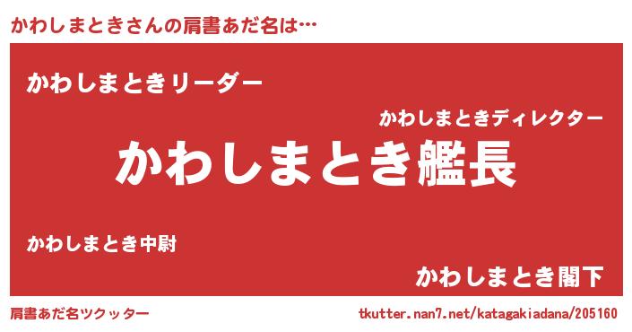 | ヒーロー風カッコイイあだ名 | 『幻影騎士カワ』『ネオカワシマトキ』 |