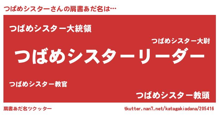 | 男性向けラノベタイトル風あだ名 | 『つばめシスターの嫁は女の子じゃないと思った?』 |