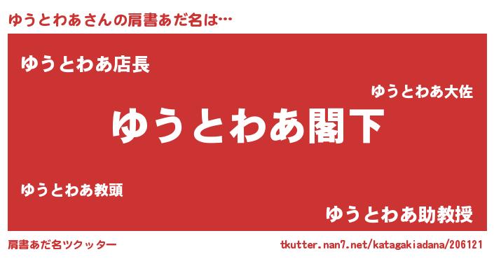 | 男性向けラノベタイトル風あだ名 | 『Re:ゆうとわあから始める異世界生活』 |