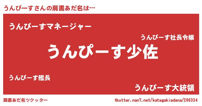 男性向けラノベタイトル風あだ名 | 『うんぴーす~年齢イコール彼女いない歴の魔法使い~』 |