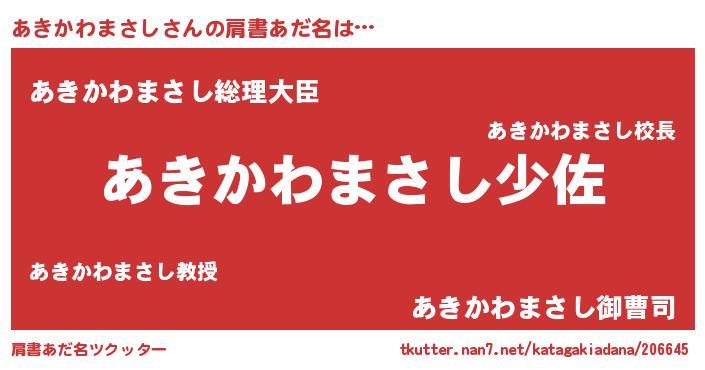 | 男性向けラノベタイトル風あだ名 | 『あきかわまさし~年齢イコール彼女いない歴の魔法使い~』 |