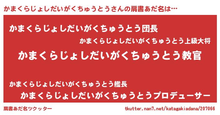 女子向けラノベタイトル風あだ名 | 『かまくらじょしだいがくちゅうとうが死なない童話 林檎のかまくらじょしだいがくちゅうとうの診療簿』 |