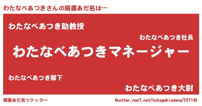 男性向けラノベタイトル風あだ名 | 『はたらくわたなべあつきさま!』 |