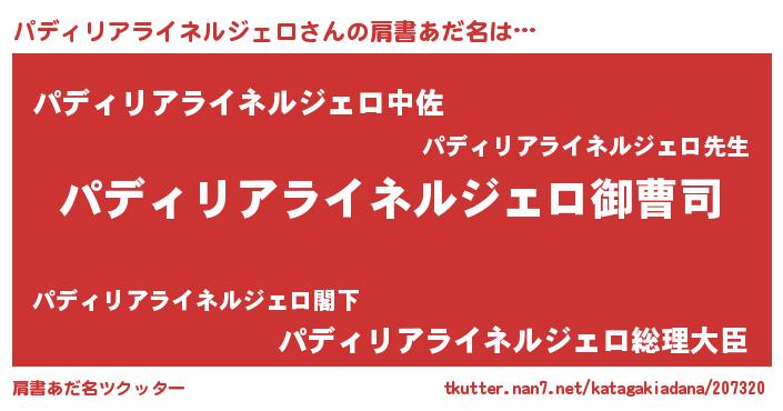 | 女子向けラノベタイトル風あだ名 | 『(仮)パディリアライネルジェロのやんごとなき事情』 |