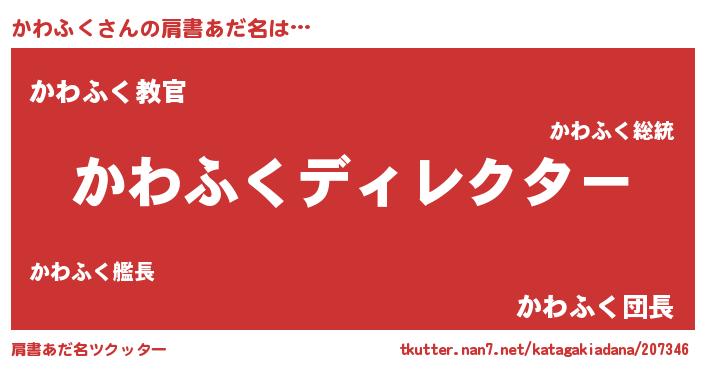 | 男性向けラノベタイトル風あだ名 | 『かわふくに滅ぼされるだけの簡単なお仕事です』 |