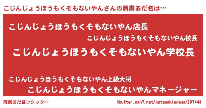 | 男性向けラノベタイトル風あだ名 | 『おまえをオタクにしてやるから、俺をこじんじょうほうもくそもないやんにしてくれ! 』 |