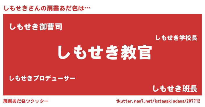 | 男性向けラノベタイトル風あだ名 | 『この素晴らしい世界にしもせきを!』 |