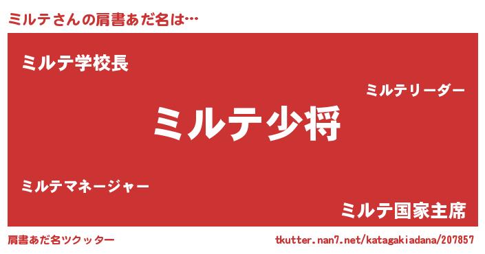 | 男性向けラノベタイトル風あだ名 | 『ミルテ~年齢イコール彼女いない歴の魔法使い~』 |
