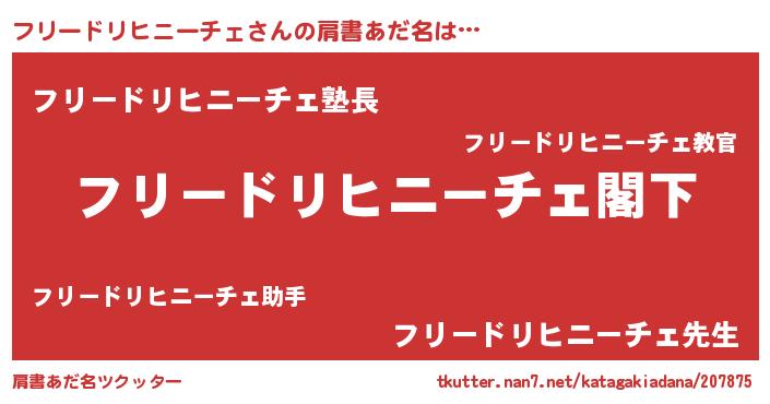 | 女子向けラノベタイトル風あだ名 | 『フリードリヒニーチェなんてお断りですっ。』 |