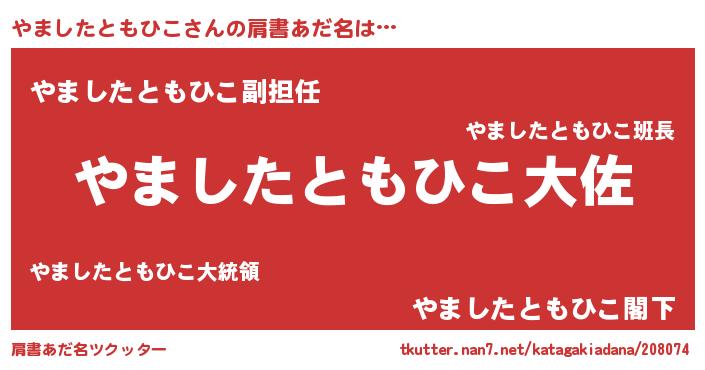 | 男性向けラノベタイトル風あだ名 | 『やましたともひこ~年齢イコール彼女いない歴の魔法使い~』 |