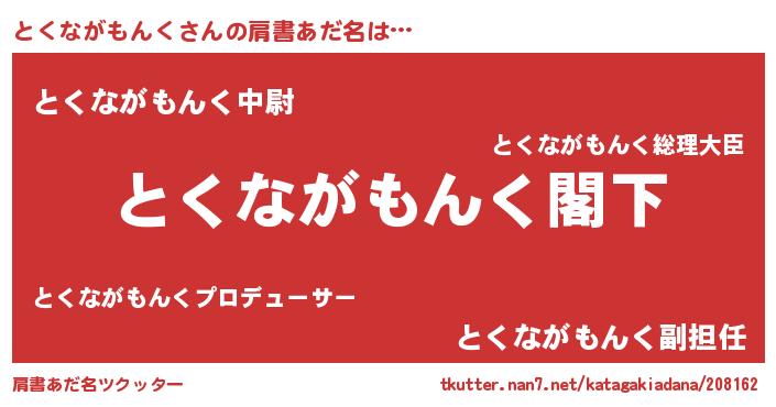 | 男性向けラノベタイトル風あだ名 | 『Re:とくながもんくから始める異世界生活』 |