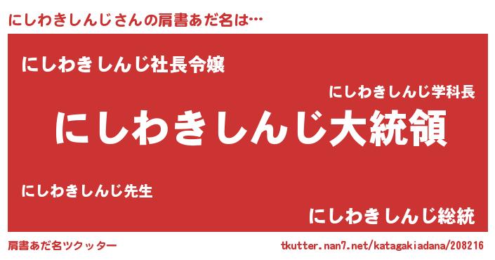 | 男性向けラノベタイトル風あだ名 | 『やはりにしわきしんじの青春ラブコメはまちがっている 』 |