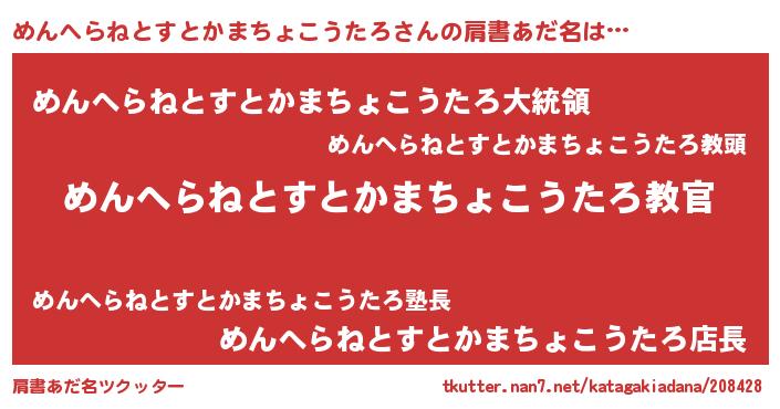 | 胡散臭い通販商品みたいなあだ名 | 『あなたにだけ特別に提供する限定10本のレアな日本酒…その名も「めんへらねとすとかまちょこうたろ」』 |