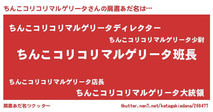 | ポケモン風あだ名 | 『ヒチンココリコリマルゲリータ』 |