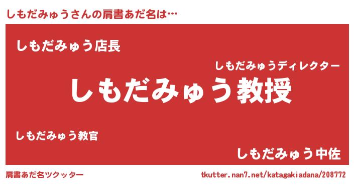 | 男性向けラノベタイトル風あだ名 | 『おまえをオタクにしてやるから、俺をしもだみゅうにしてくれ! 』 |