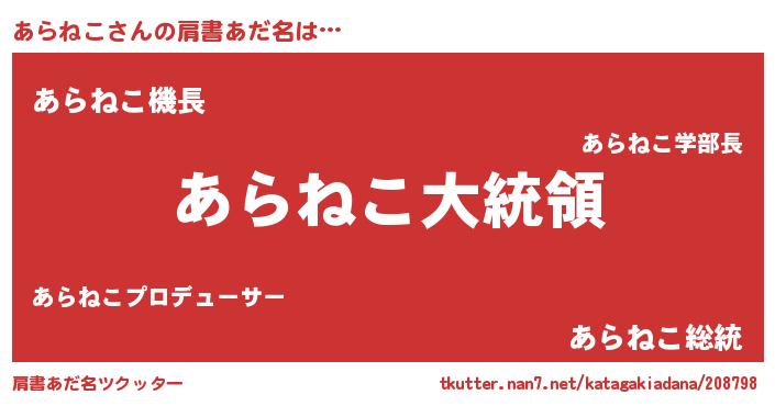 | 女子向けラノベタイトル風あだ名 | 『あらねこ伯爵の花嫁』『闇のあらねこ』 |