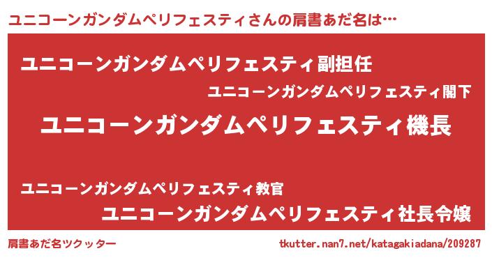 | 意味不明あだ名 | 『永久保存ユニコーンガンダムペリフェスティ』 |