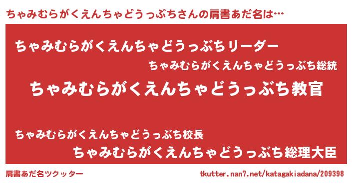 | 男性向けラノベタイトル風あだ名 | 『この素晴らしい世界にちゃみむらがくえんちゃどうっぶちを!』 |