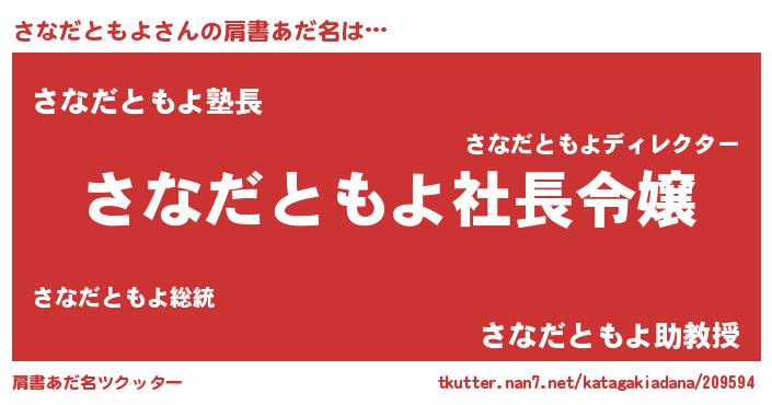 | ヒーロー風カッコイイあだ名 | 『スーパーサナダトモヨ』『暗黒騎士サナ』 |