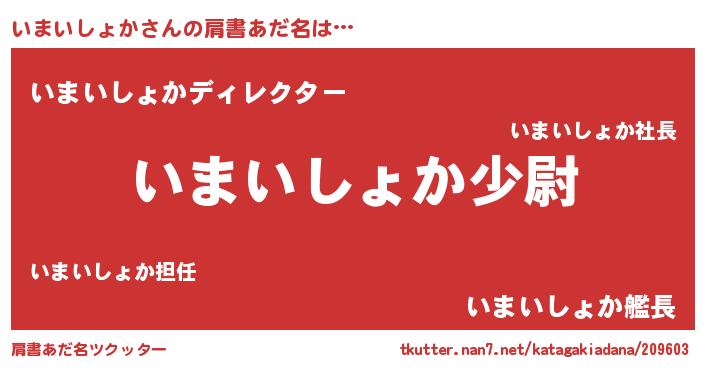 | 男性向けラノベタイトル風あだ名 | 『いまいしょか~年齢イコール彼女いない歴の魔法使い~』 |