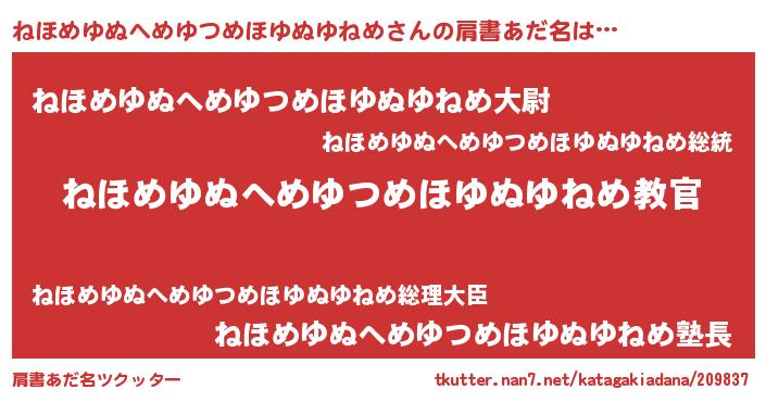 | 男性向けラノベタイトル風あだ名 | 『この素晴らしい世界にねほめゆぬへめゆつめほゆぬゆねめを!』 |